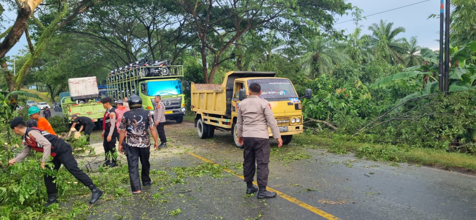 Atas bentuk keperdulian Sat Samapta Polres Batu Bara.yang Melaksanakan pembersihan batang pohon dan ranting ranting yang tumbang di jalan Lintas Desa Sumber padi Kec.Lima puluh Batu Bara.