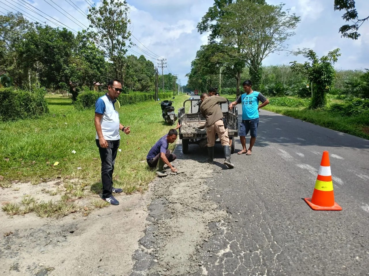 Kaloborasi Management PTPN IV Regional l dan Pangulu Mariah Jambi Gelar BakSos Pengecoran Jalan Berlubang di Jalan Lintas Siantar