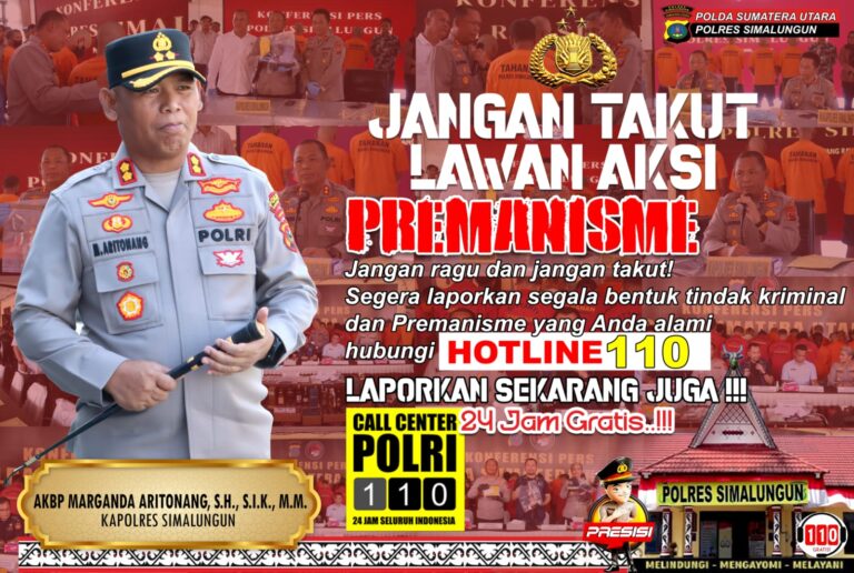 Aktivisnews.id-SIMALUNGUN, 10 Mei 2025 – Kepolisian Resor (Polres) Simalungun mengajak masyarakat untuk tidak takut melaporkan segala bentuk tindak kriminal dan premanisme melalui layanan Call Center Polri 110 yang beroperasi 24 jam. Himbauan ini disampaikan langsung oleh Kapolres Simalungun AKBP Marganda Aritonang, S.H., S.I.K., M.M., sebagai bagian dari upaya meningkatkan keamanan dan ketertiban masyarakat (kamtibmas) di wilayah hukum Polres Simalungun.