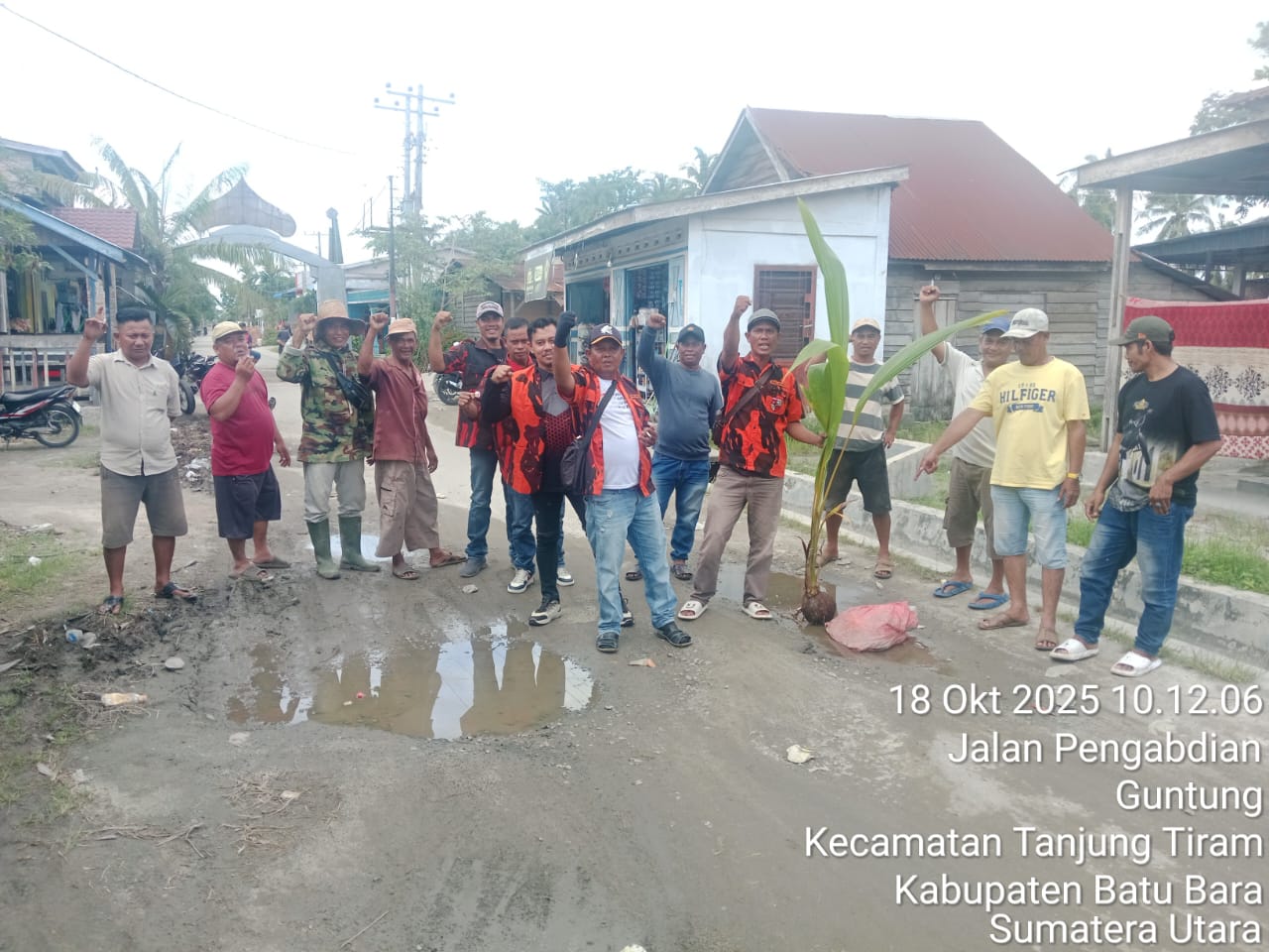 Aktivisnews.id-Batu Bara Ketua(PAC)Pemuda Pancasila PP Kec.T.riram Batu Bara Bersama Masyarakat Desa Guntung turun kelokasi jalan Yang rusak Para.seperti kubangan Kerbau.Sabtu (18/10/2025)