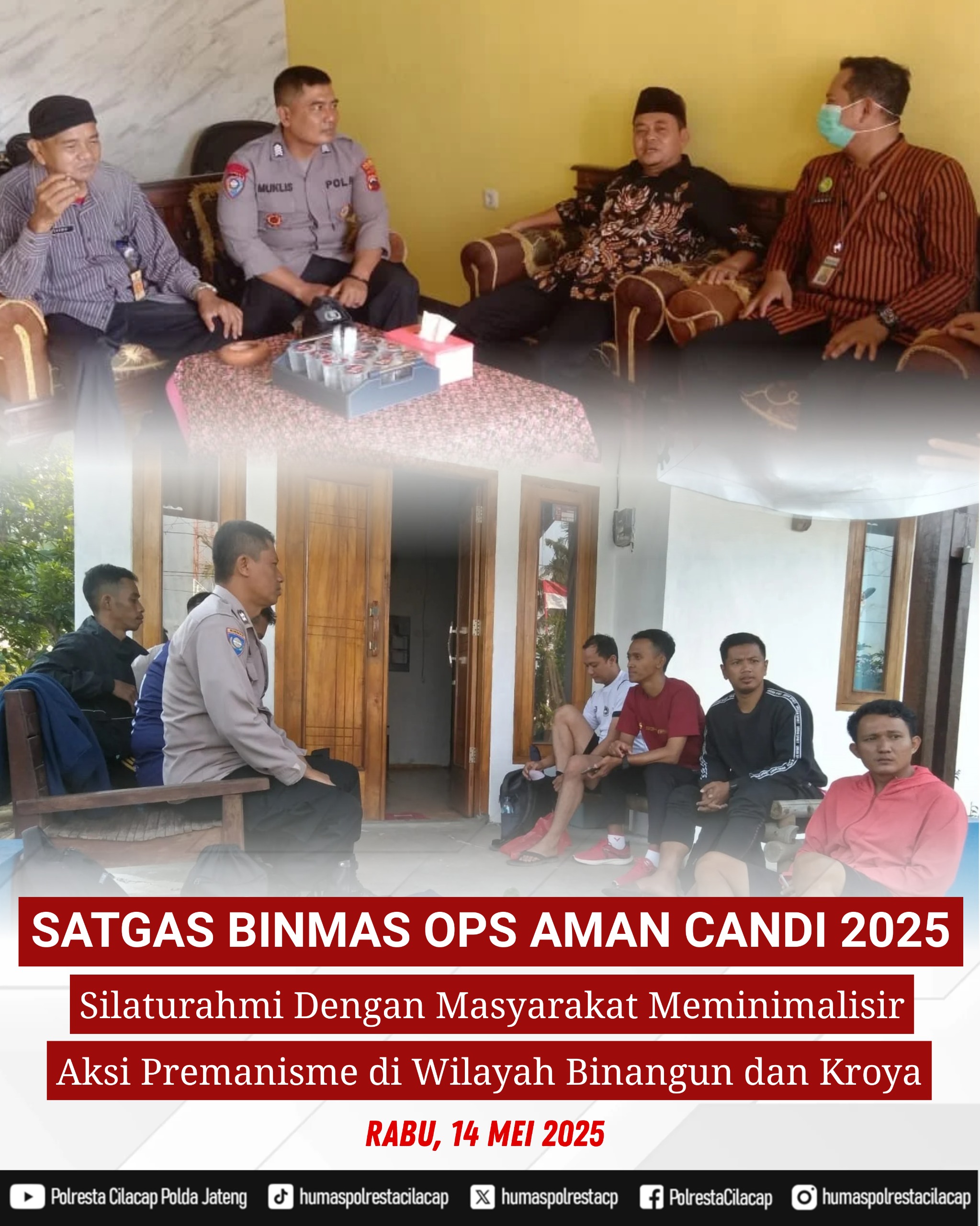 Kegiatan diawali di Desa Ayam Alas, Kecamatan Kroya, Kabupaten Cilacap, di mana petugas melakukan silaturahmi dan koordinasi dengan tokoh agama, tokoh masyarakat, serta tokoh pemuda setempat. Kegiatan ini bertujuan mempererat silaturrahmi antara kepolisian dan masyarakat dalam menjaga kondusivitas wilayah. Selain menjalin silaturahmi, Satbinmas juga menyampaikan pesan agar masyarakat turut serta menjaga keamanan dan ketertiban di wilayah Kabupaten Cilacap dari berbagai tindakan premanisme, seperti pemerasan dan pungutan liar (pungli). Masyarakat diharapkan segera melaporkannya ke nomor HP Polsek Kroya 081217788152 atau Call Center 110 agar dapat segera ditangani oleh pihak berwajib.